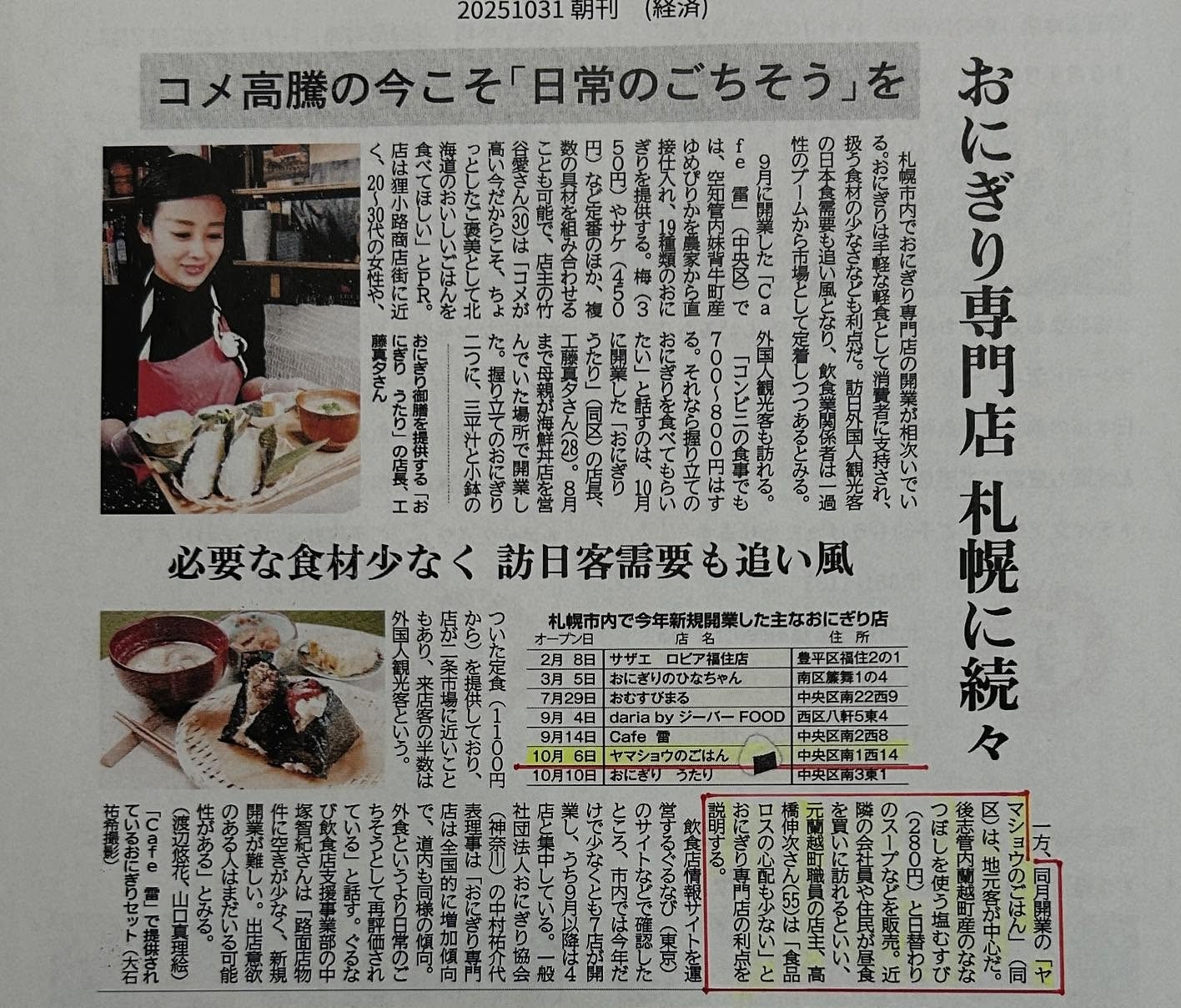 2025年10月31日発行の北海道新聞(朝刊・経済面) にて、ヤマショウのごはんが「おにぎり専門店特集」のひとつとして紹介されました。